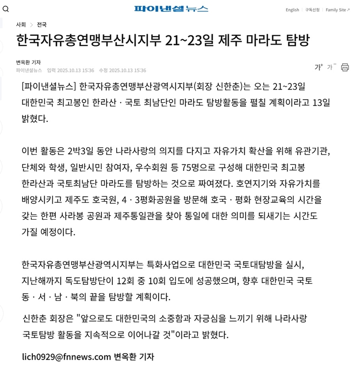 [언론보도]나라사랑국토탐방(한라산, 마라도 등) 21일(화)~23일(목) 예정