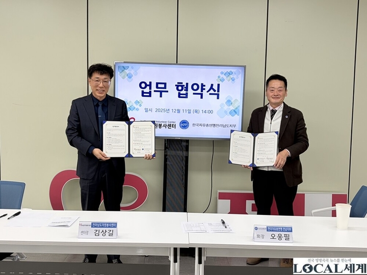전라남도자원봉사센터와 한국자유총연맹 전라남도지부는 11일 무안군 삼향읍 전문건설회관에서 자원봉사 활성화와 지역사회 발전을 위한 업무협약을 체결했다. 협약식에는 양 기관 관계자 30여 명이 참석했다.