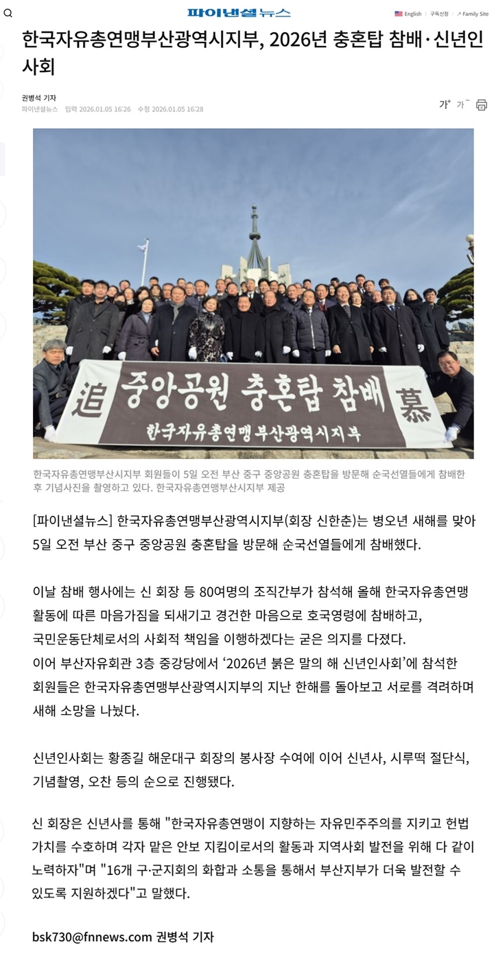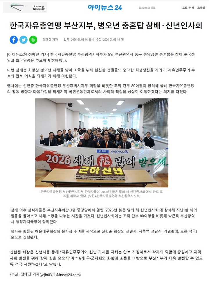 [언론보도] 한국자유총연맹부산광역시지부 2026년 병오년 충혼탑 참배·신년인사회