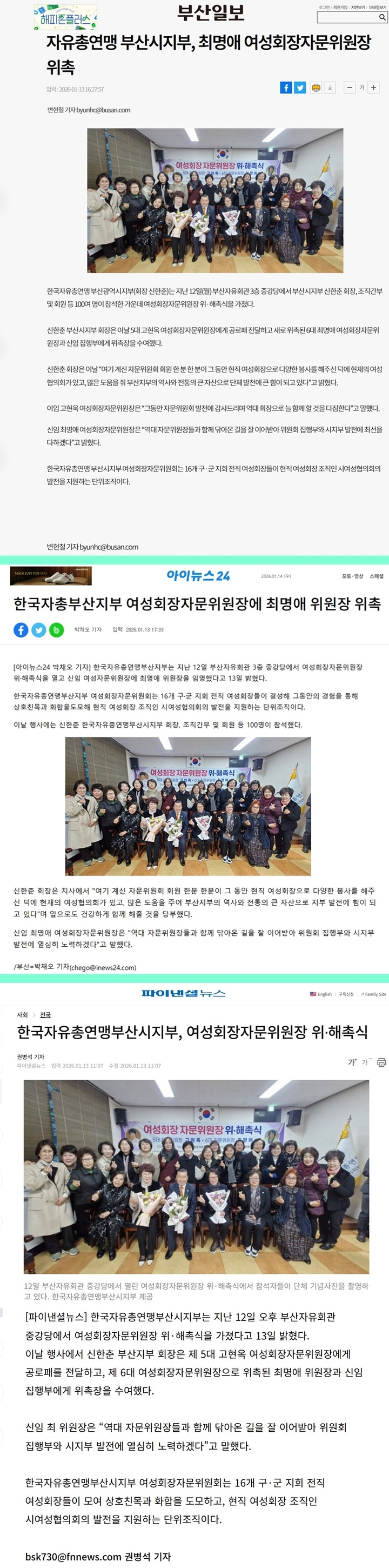 | 3491 | 부산지부 | [언론보도] 한국자유총연맹부산광역시지부 2026년 병오년 충혼탑 참배·신년인사회 | 부산광역시지부 | 2026/01/06 | 0 | 94 |