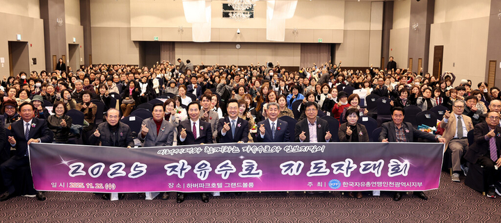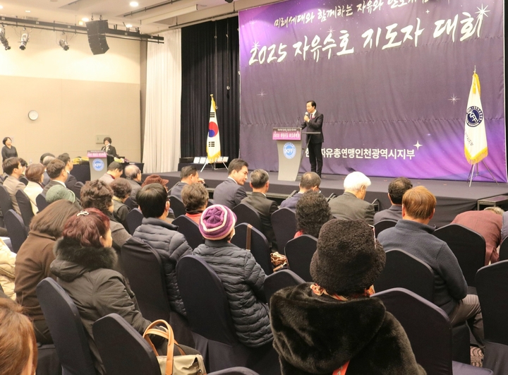 한국자유총연맹 인천시지부(회장 이정태)는 11월 26일(수) 하버파크 호텔 대연회장에서 하병필 인천시 행정부시장, 정해권 인천시의회 의장, 도성훈 인천시교육감을 비롯한 인천지역 기관단체장과 회원 400여명이 참석한 가운데 2025년 사업을 평가하고 밝아오는 새해의 힘찬 전진을 다짐하는 “2025 자유 수호 지도자대회”를 개최했다.