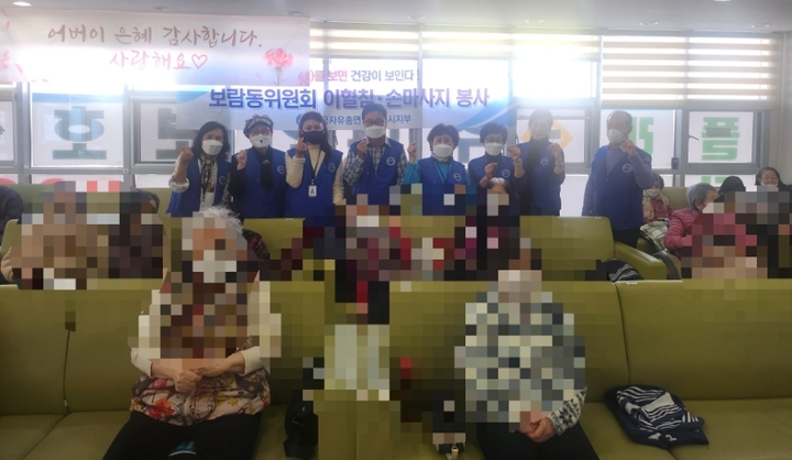 회원들은 기통석을 귀혈자리에 붙여 어르신들의 건강관리를 해드리고 로션과 오일을 이용하여 혈자리를 자극하는 손맛사지 봉사를 진행했습니다. 봉사에 적극적으로 참여해 주신 보람동 회원님들 감사드립니다.