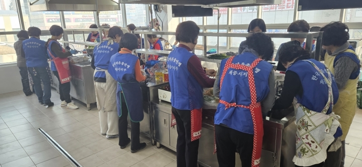 회원들은 이른 아침부터 세종시 남부통합보건지소 조리실에 모여 닭볶음탕, 황태국, 봄동겉절이, 느타리뜰깨볶음, 참치볶음, 깻잎김치 등 6가지 반찬을 정성을 다해 준비하여 각 가구(15가구)에 전달했다.