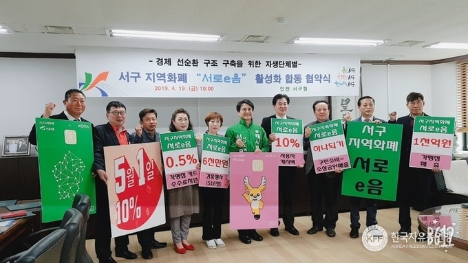 한국자유총연맹 인천서구지회(회장 강신덕)에서는 4월19일(금) 오전10시 인천서구청에서 경제선순환 구조 구축을 위한 자생단체별 『서구 지역화폐 “서로e음” 활성화 합동 협약식』이 참석하였다. 이재현 서구청장은 강신덕 서구지회 회장을 비롯한 관내 자생단체 회장들에게 5월1일 발행되는 서로e음 지역화폐의 성공적인 정착을 통하여 서구 전 지역의 경제가 활성화되는데 한마음으로 동참해주기를 당부하였다. 본 연맹 서구지회에서는 지역경제 활성화를 위한 이번 사업에 지역주민 대상으로 홍보활동을 적극적으로 실시하고 있다.