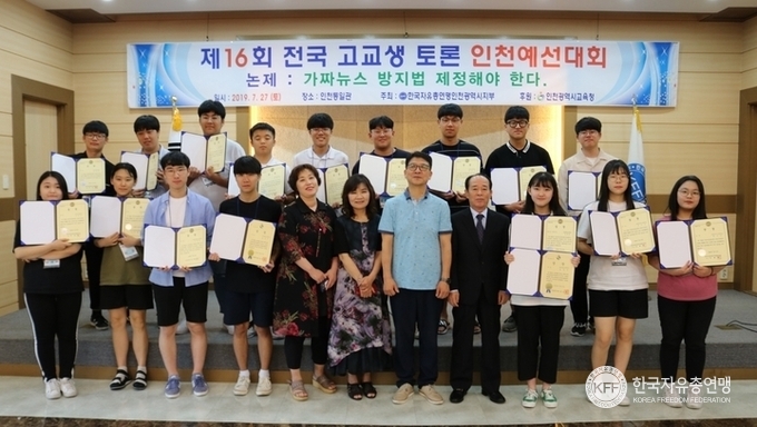 인천지부 「제16회 전국 고교생 토론 인천 예선대회」 개최 한국자유총연맹 인천광역시지부(회장 이정희)는 7월27일(토) 인천통일관에서 ‘가짜뉴스 방지법을 제정해야 한다’는 논제로 ‘제16회 전국 고교생 토론 인천 예선대회’를 개최했다. 대회는 패널식 집단토론과 대좌식토론 방식으로 진행됐다. 참가한 인천지역 고등학생 16개 팀은 자신들의 주장을 펼치며 열띤 토론을 벌였다.